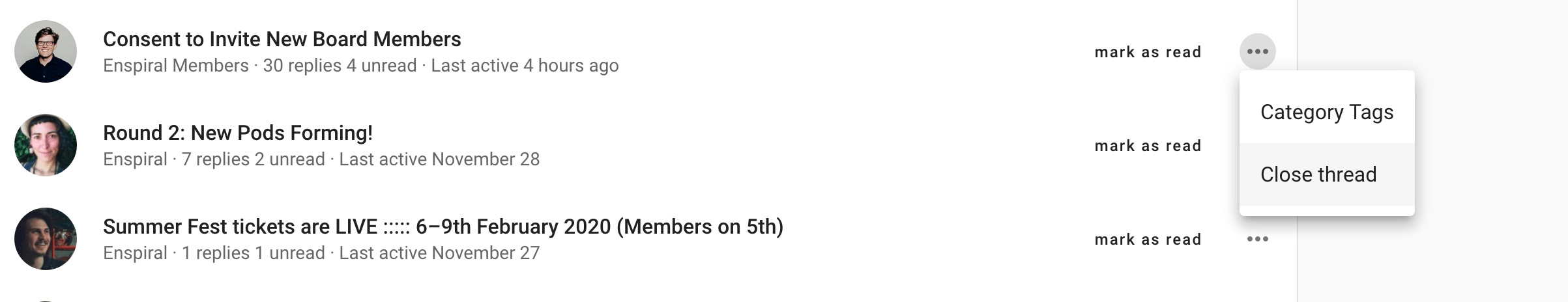 Re-opening a closed discussion is done from within the discussion's page – again, the three horizontal dots (⋯). See organizing discussions for a depiction.