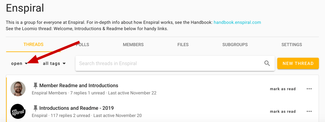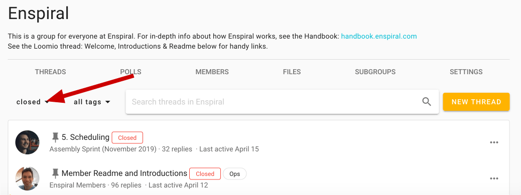 To view closed discussions, first navigate to the relevant group page. You will need to use the drop-down just under the Discussions tab to change the discussion filter from its default of open.