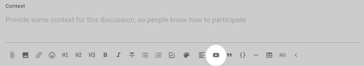 You can embed a video from popular video platforms like Youtube and Vimeo into Loomio anywhere there is a text space; when starting a thread or poll, writing a comment, or updating your group description. The embed video icon is one of the formatting tools, under the space where you write text in Loomio.