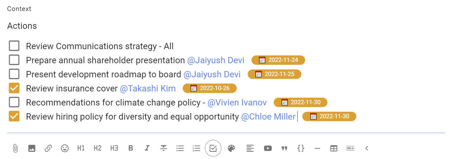 Use the task list to add check boxes for each task, and assign someone with a due date for completion.