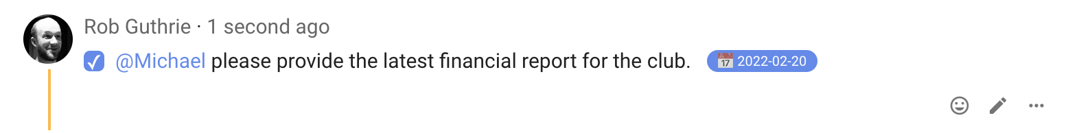 From here you can name the task, assign someone with the standard @mention feature, and even set a due date with a reminder notification.