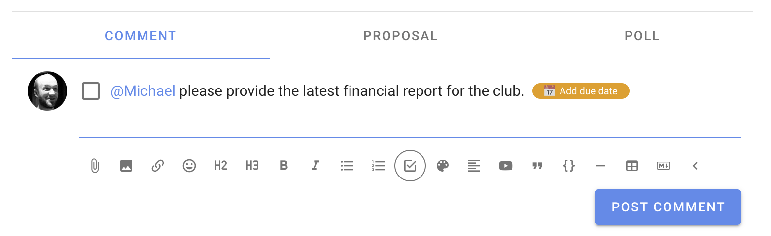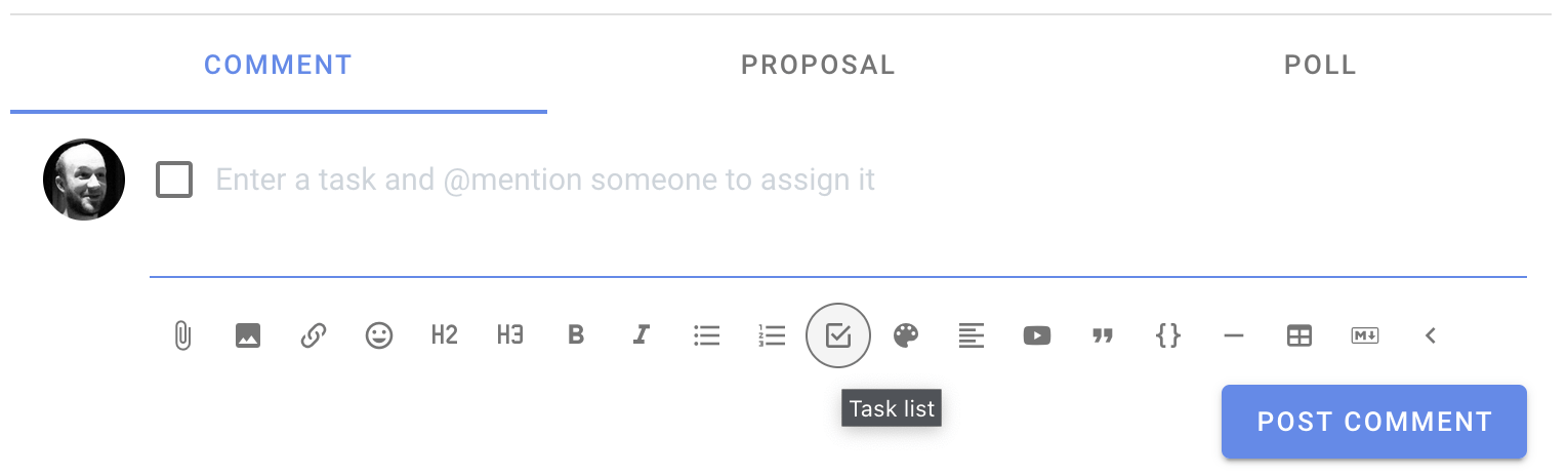 When you are writing a comment or thread on Loomio click the "Task list" button from the text editor toolbar to add a task.