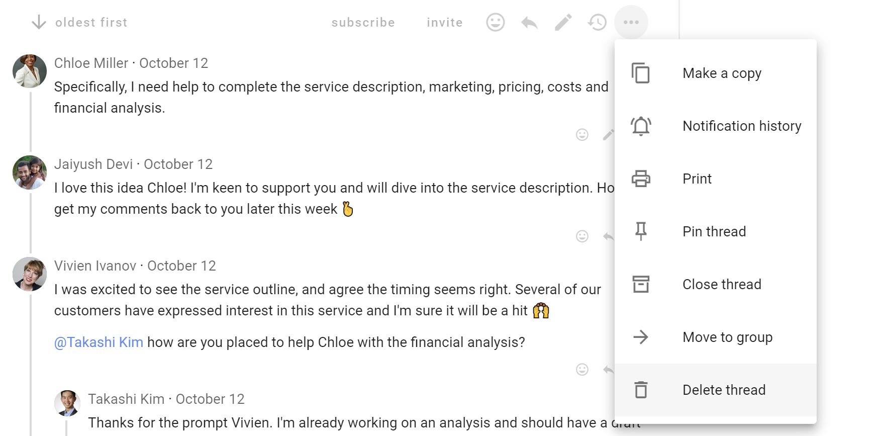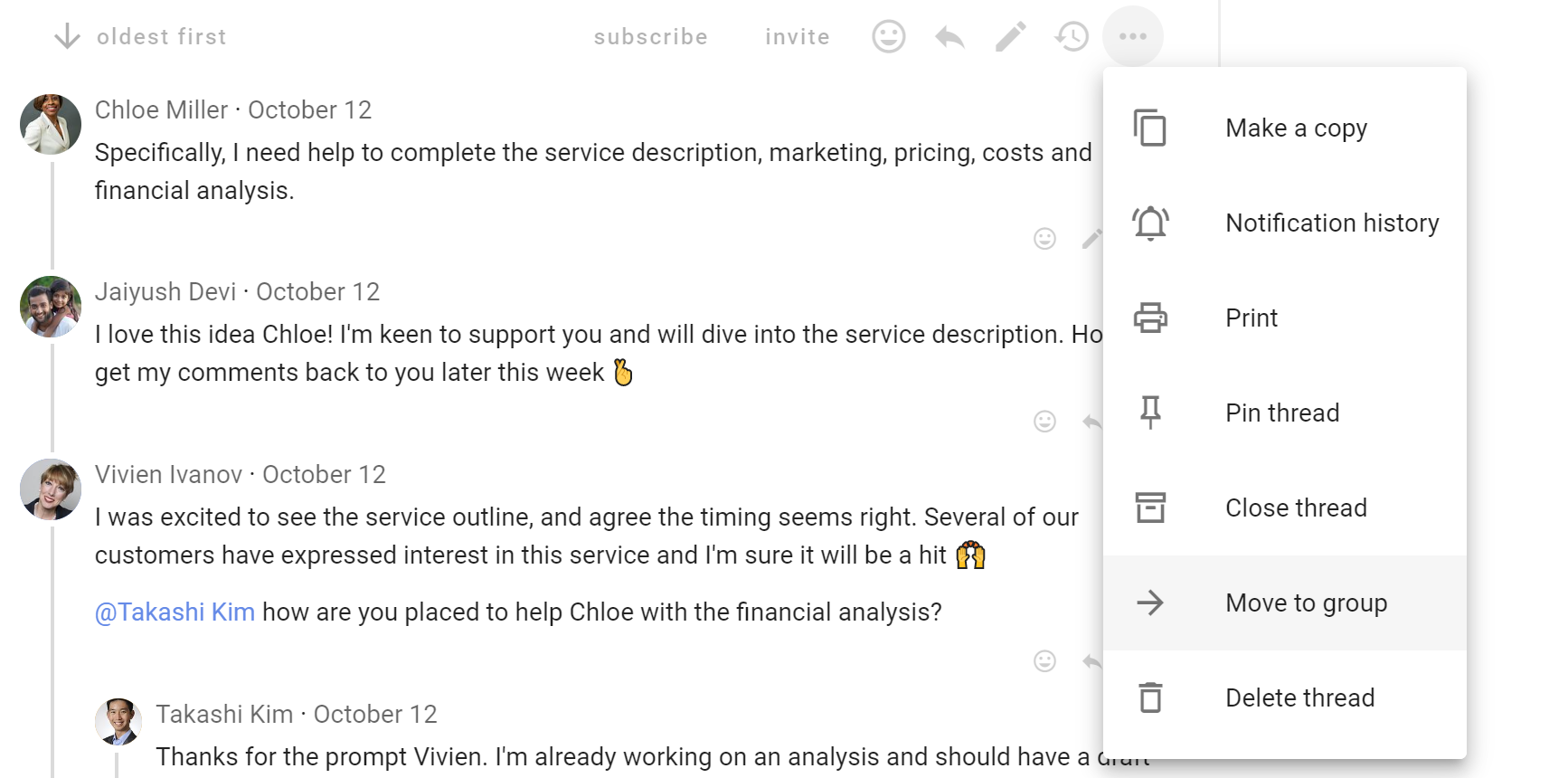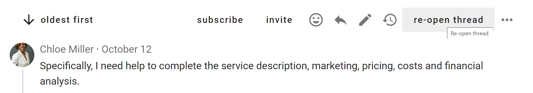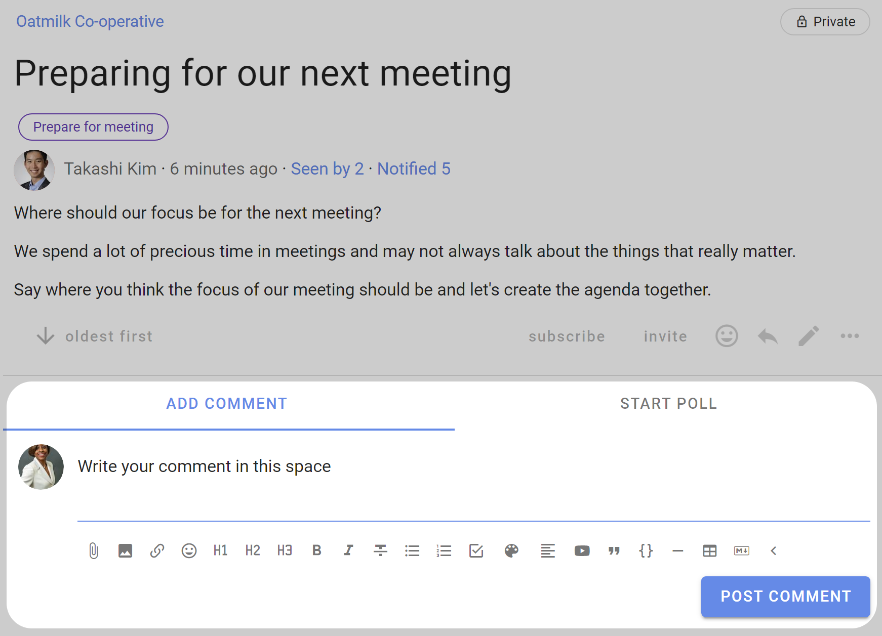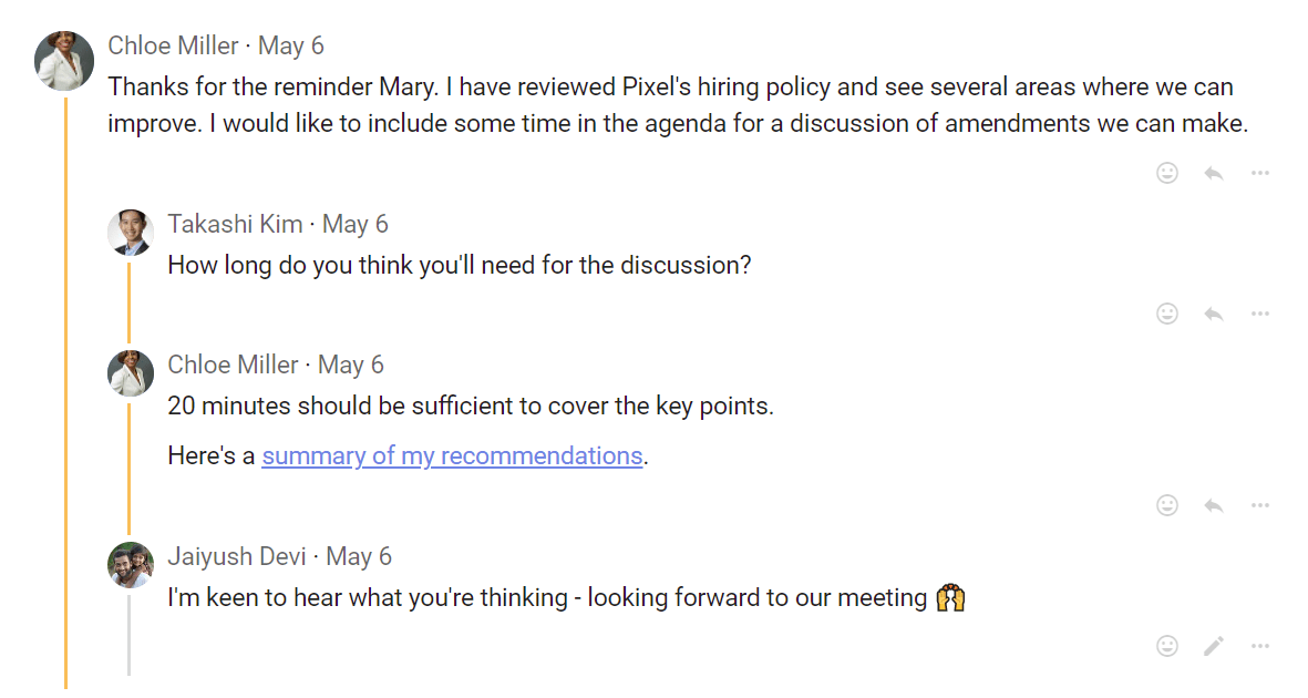 The most common activity in a discussion is commenting. Comments are visible to anyone who has permission to see the discussion.