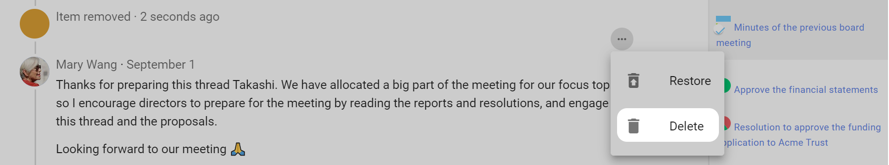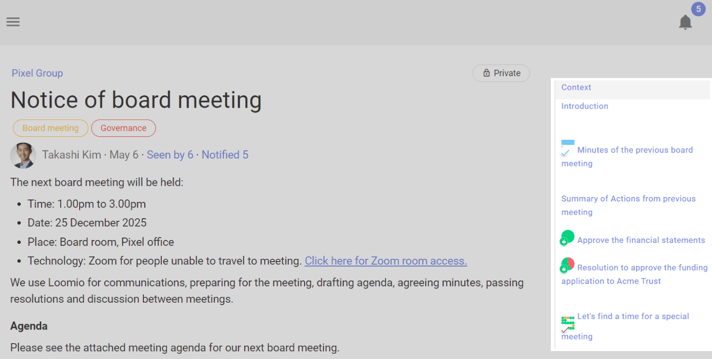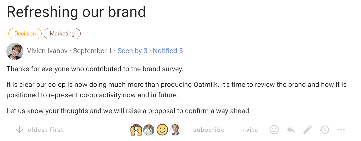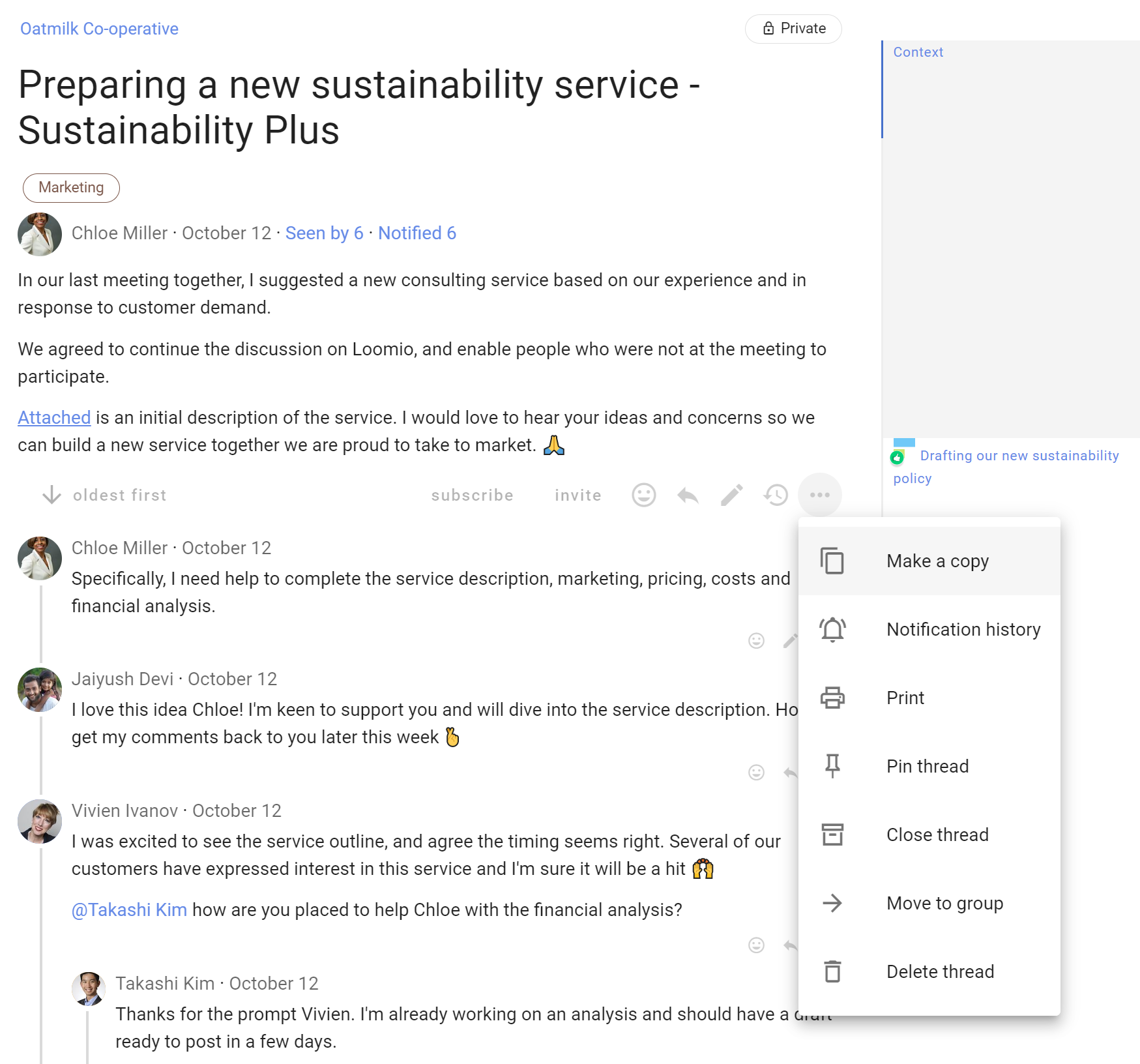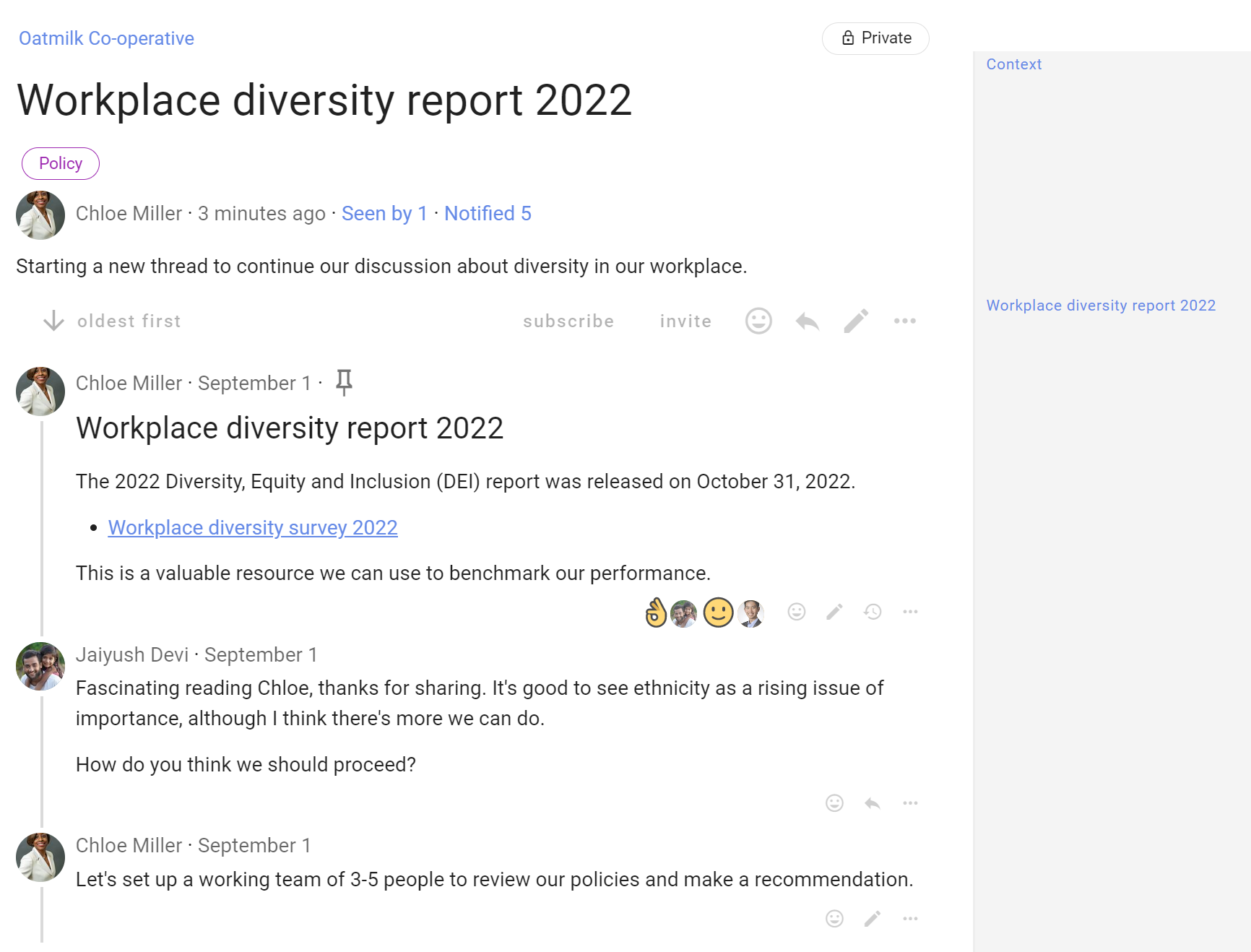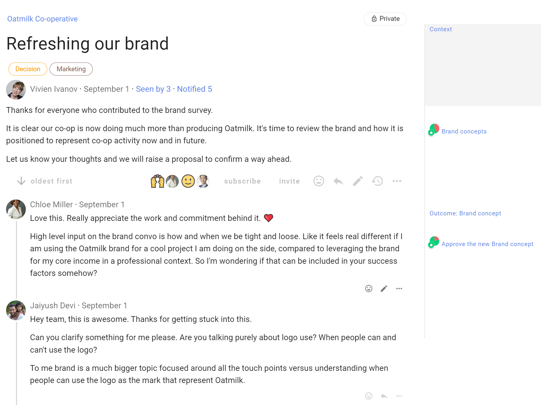 As the discussion progresses, update discussion context. Think of the context like a whiteboard in your meeting room, where you can write the agenda, the outcomes intended and how you plan to get there.