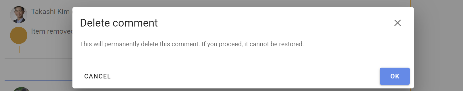 A warning message will appear and ask you to acknowledge that the comment will be permanently from the discussion and cannot be restored.