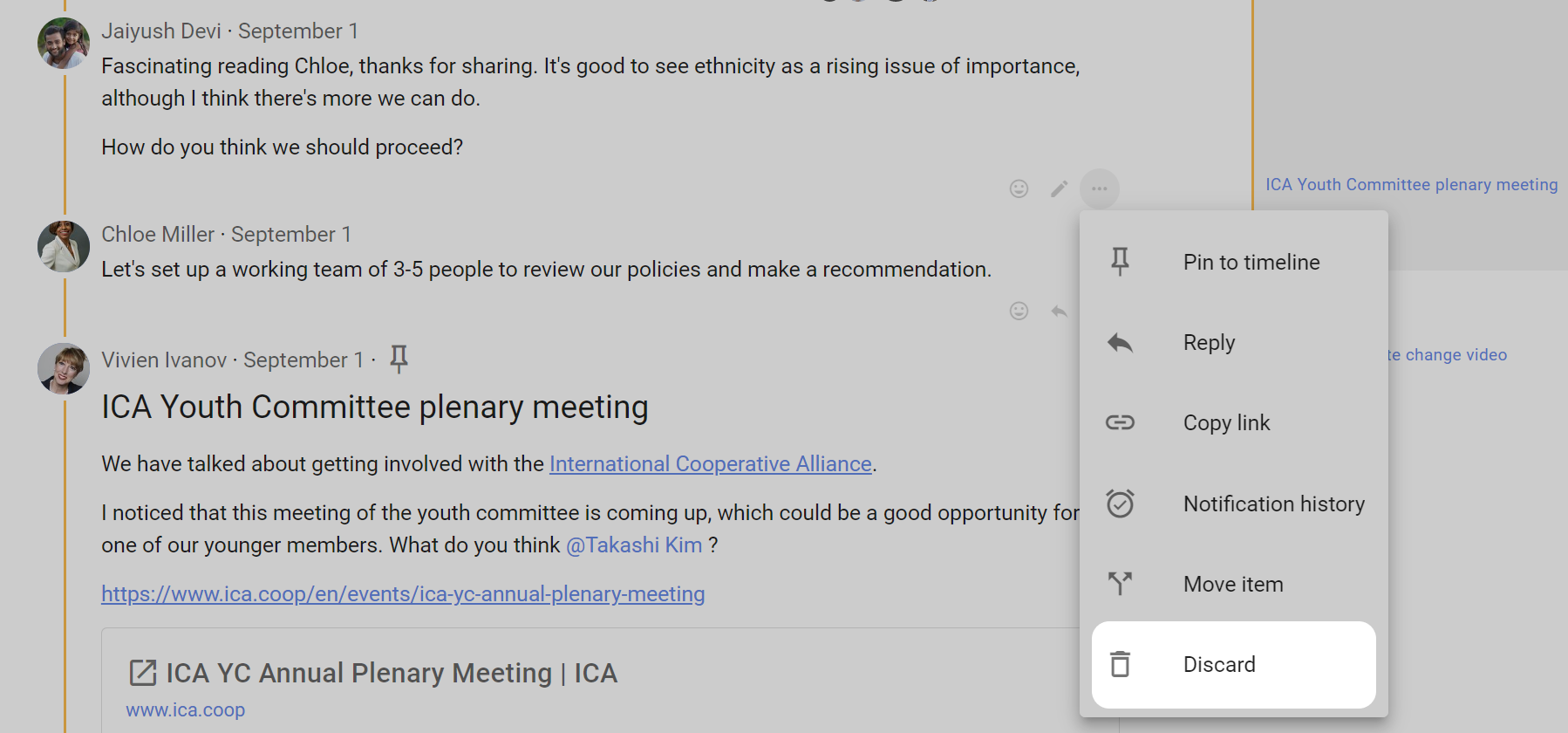 The discussion timeline is on the right of the discussion, and helps you quickly access comments and polls in a discussion. It is a visual, interactive history automatically building as the discussion progresses with important comments, polls and milestones.