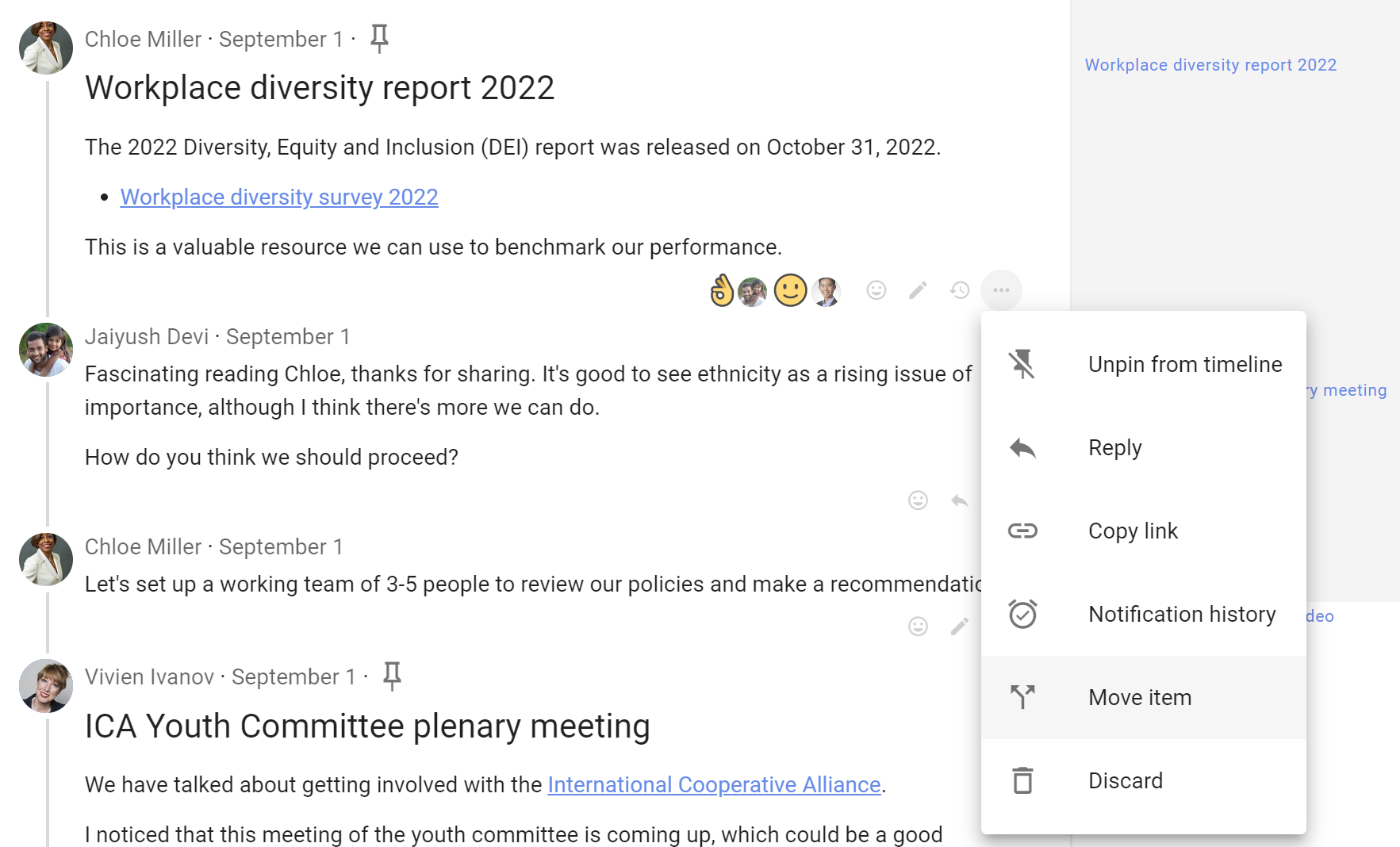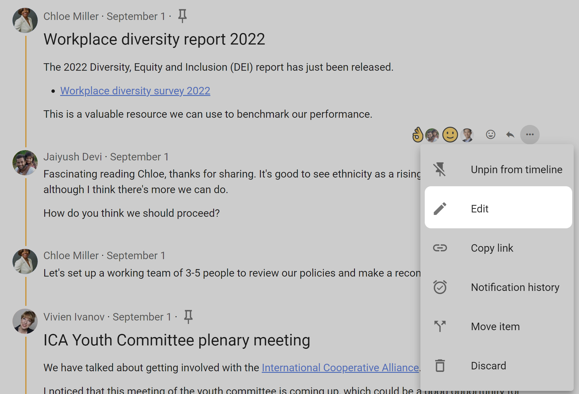 Discussion interaction and administration tools - Under discussion context is a range of tools where you can watch, invite, react, reply and edit the discussion context. Click on the 3 dot menu (...) to see more tools.
