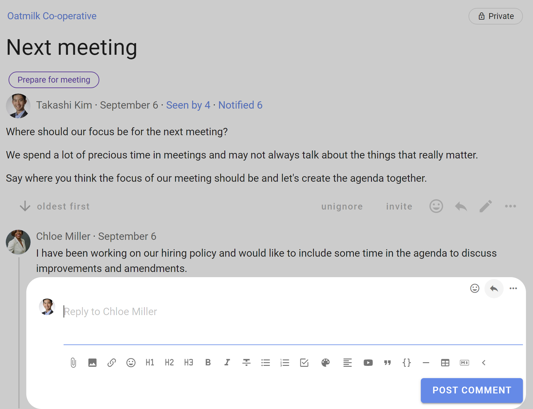 When you have written your text, use Post Comment to instantly publish the comment. Your comment will be visible to anyone who has permission to see the discussion.