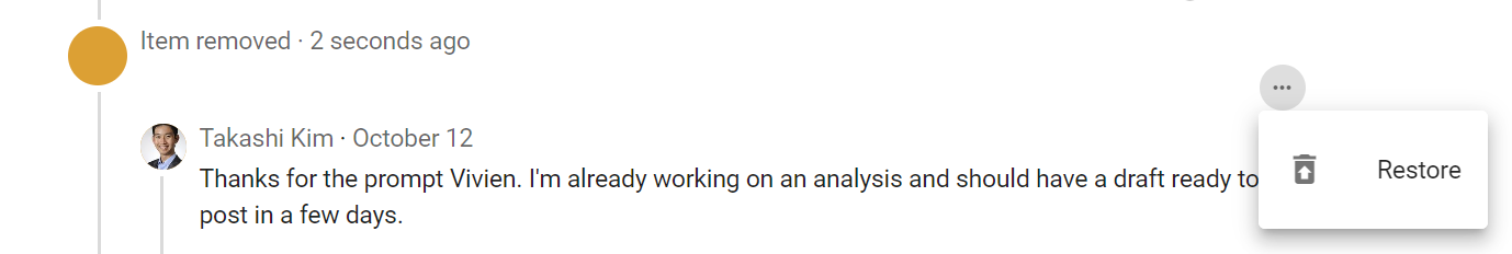 You can restore your own comment with Restore. The location of the comment will be labeled as Item removed. Click on the 3 dot (...) menu located at the bottom right of your discarded comment and select Restore.