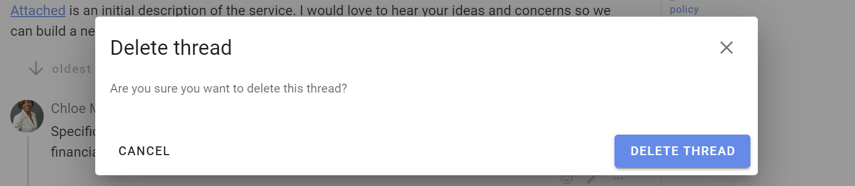 You will be asked to confirm you want to delete the discussion. Delete discussion can not be undone.