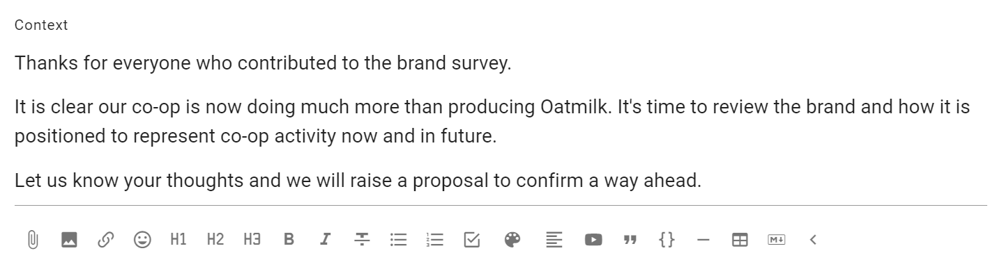 At the bottom of the context panel is a formatting bar, where you can format text, attach files, images and embed a video.