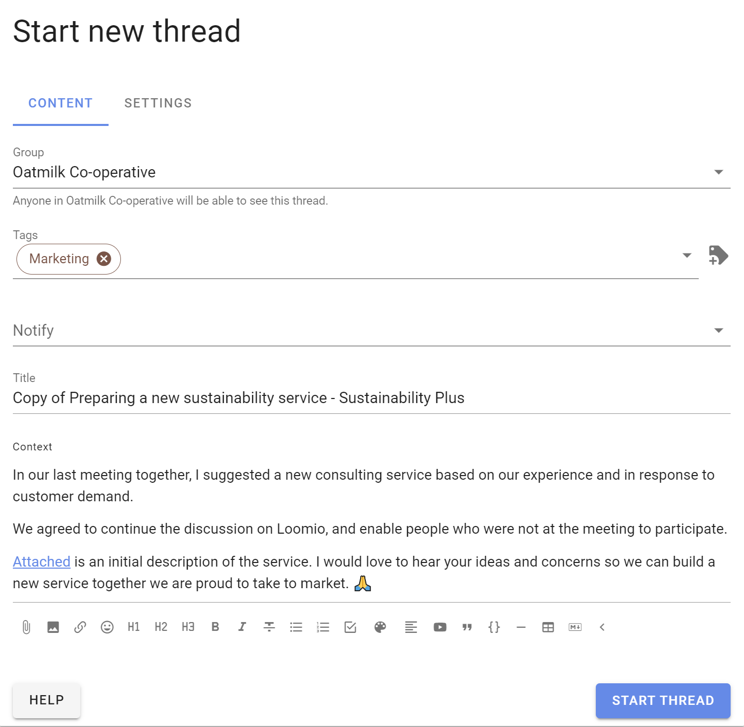 Think of your group as you write content in the discussion context. Your aim is to get a discussion going, so consider how you can motivate people to participate. In general, keep the discussion context simple and clear.