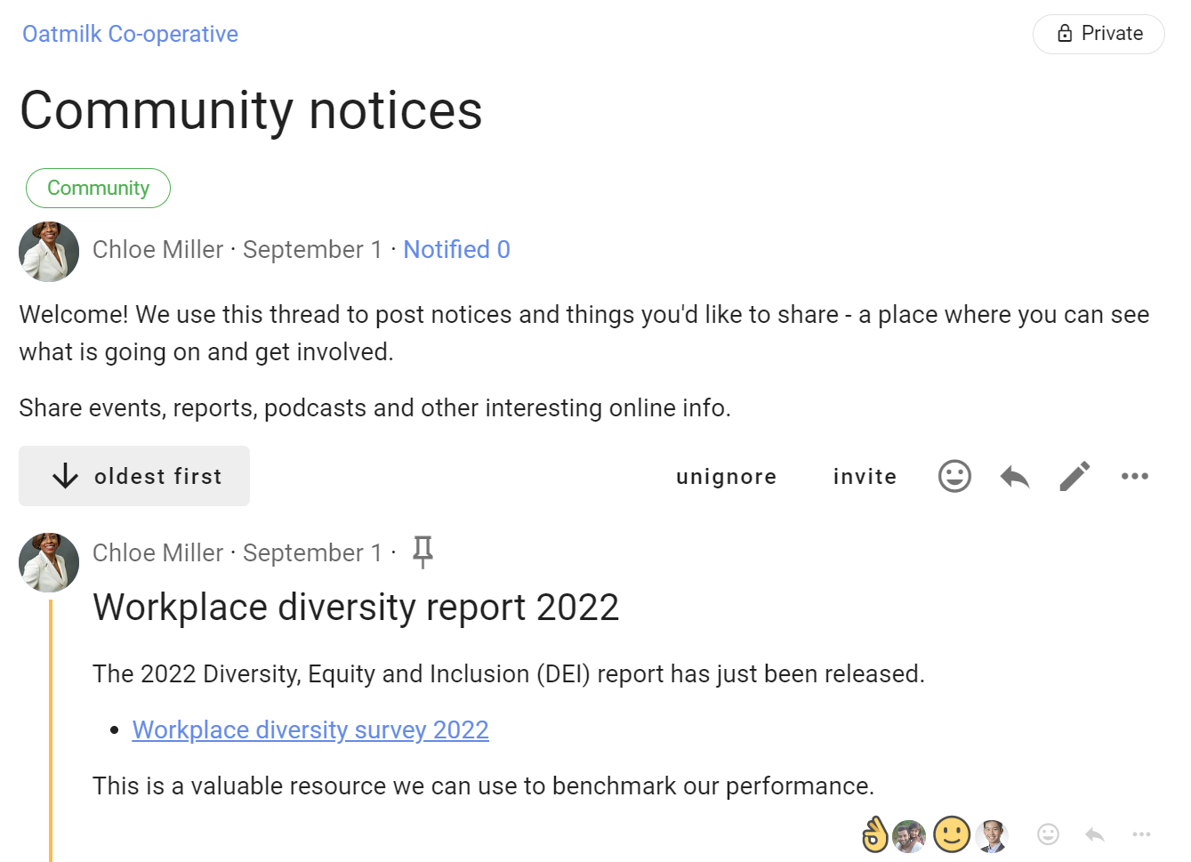 Discussion privacy - At the top right of the discussion page is a tag showing that this discussion is private - only members of the group, and anyone specifically invited to the discussion, can see and participate in the discussion.