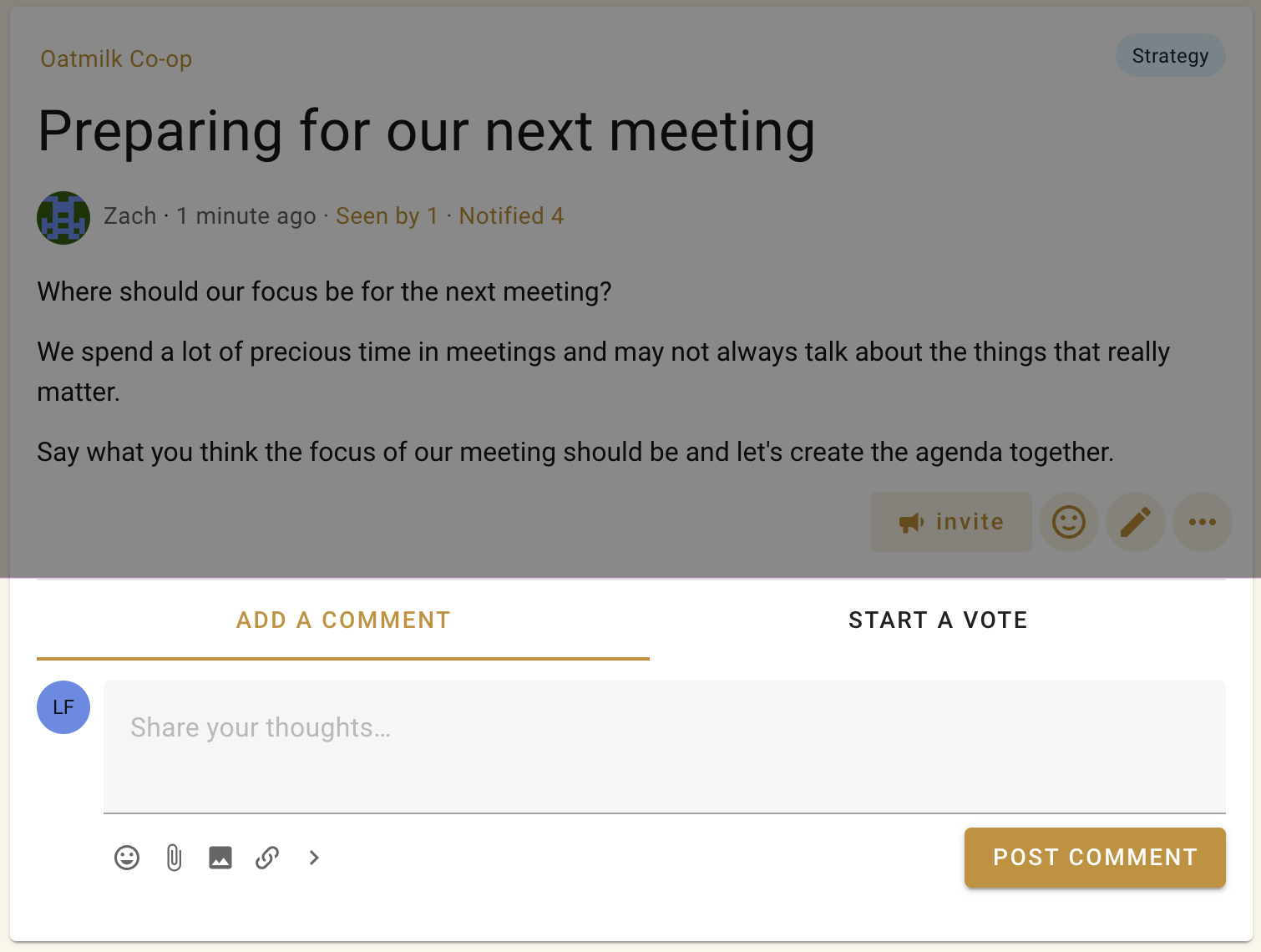 You can write a comment in a thread, and people can reply, react or post their own comment to continue the discussion.