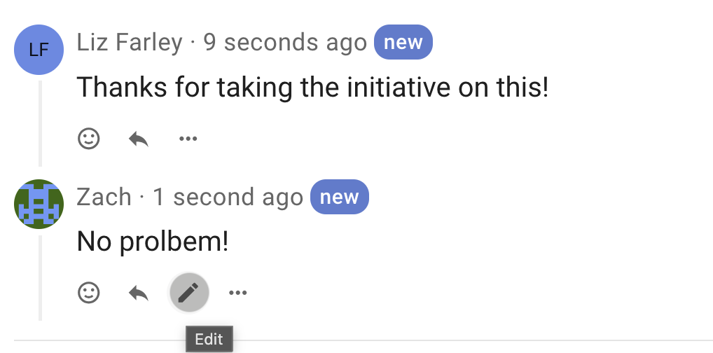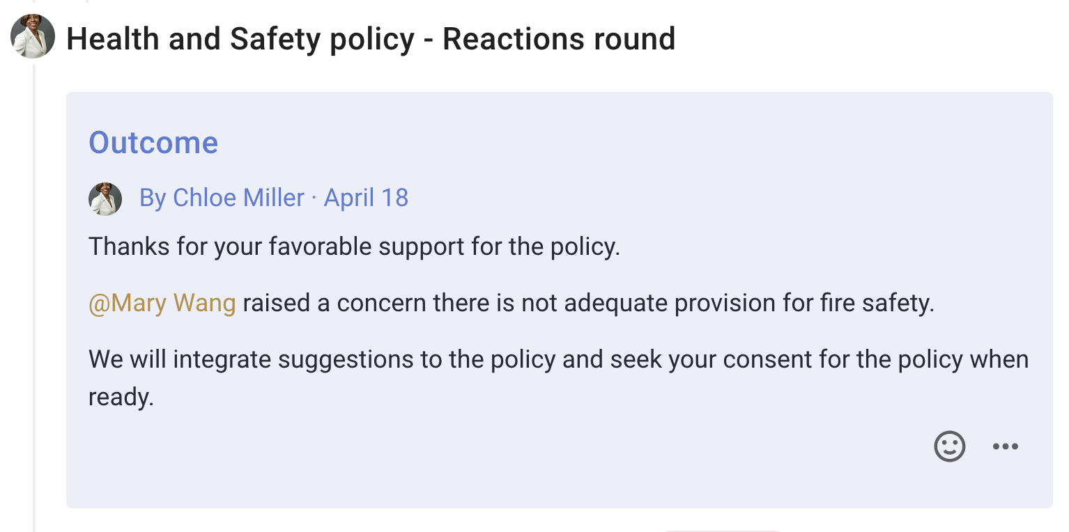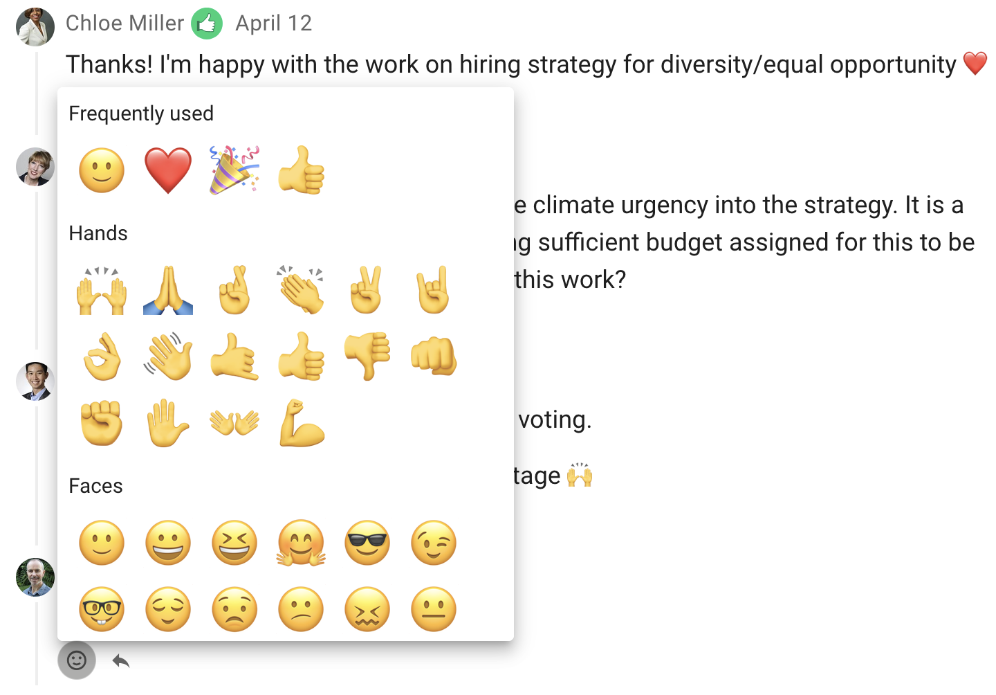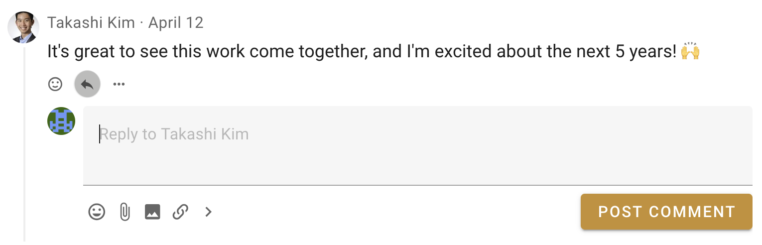 Reacting to a comment is a great way to encourage and acknowledge a comment by letting the comment author know how you feel. It is a quick and light-weight way to participate that does not require any text, nor send an email. Click the smile emoji icon beneath a comment to leave an emoji reaction.