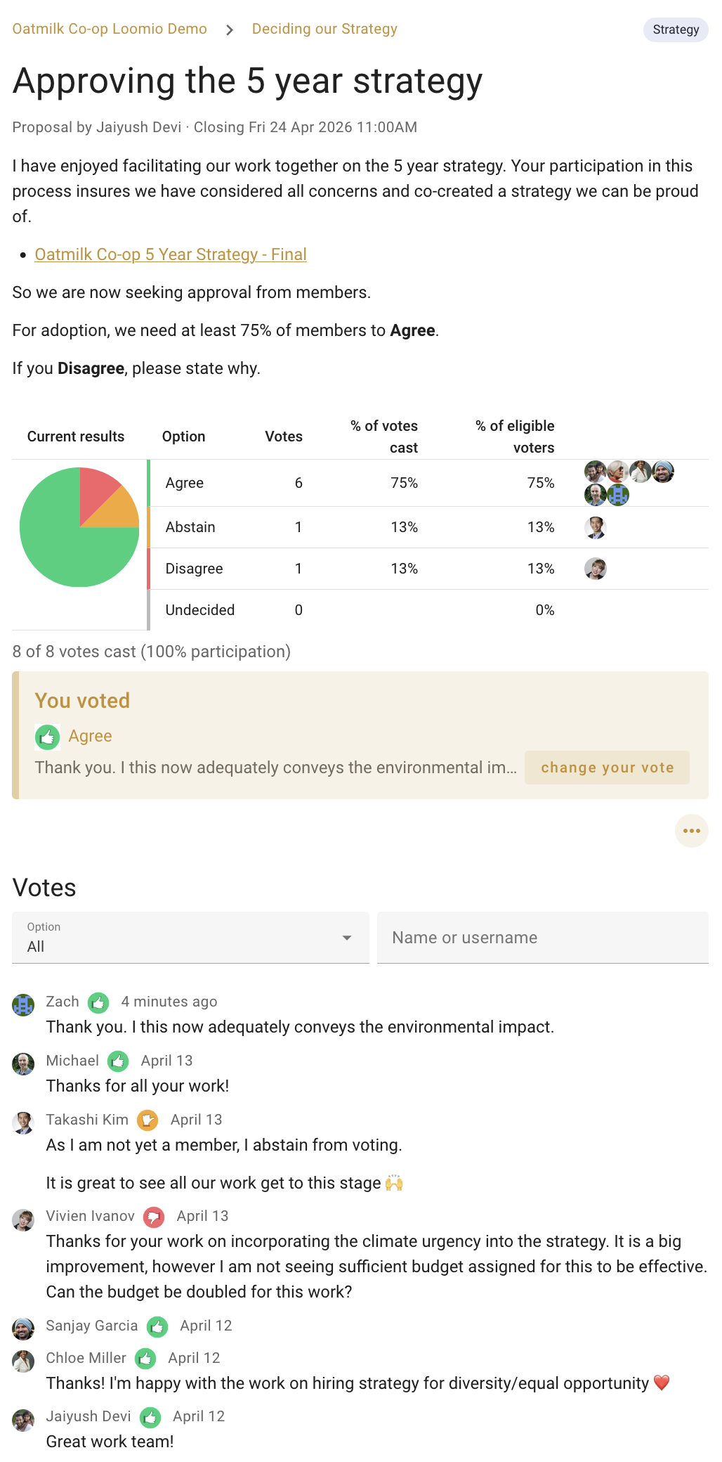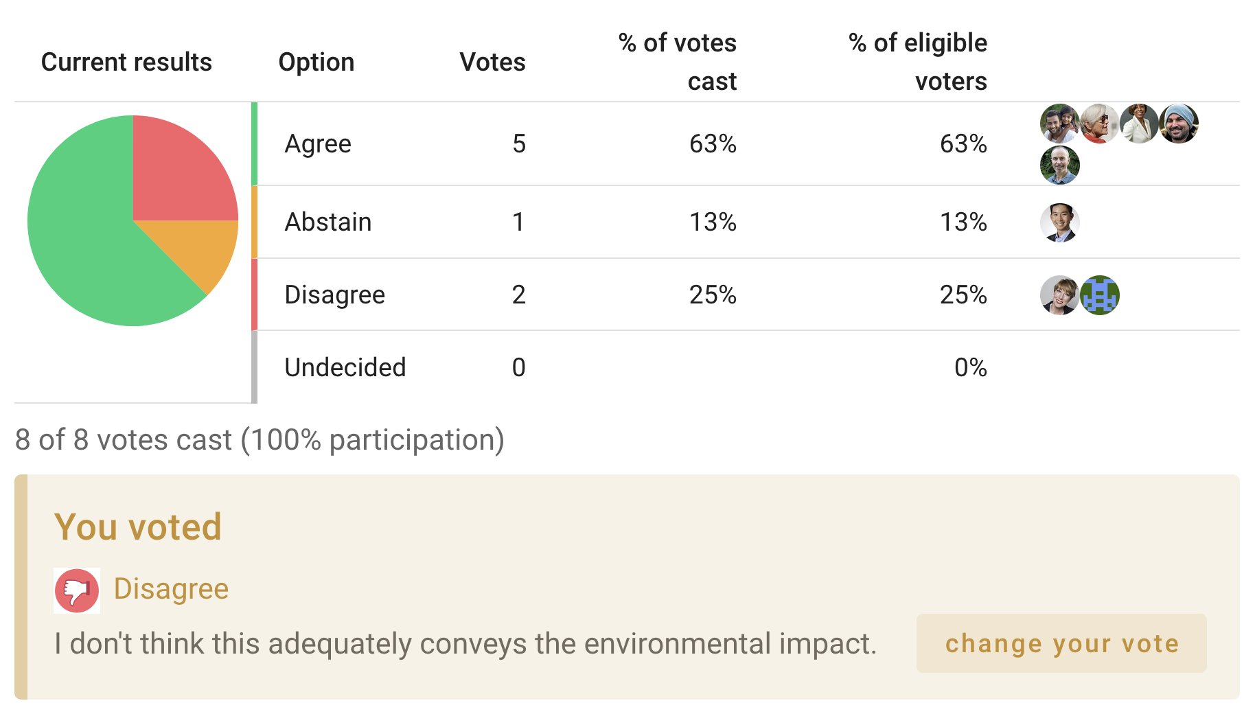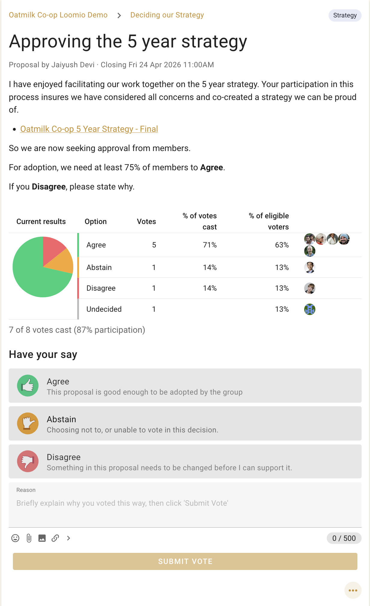 There are many types of polls. The example below shows a typical proposal with voting options of Agree, Abstain or Disagree. Other options may be available.