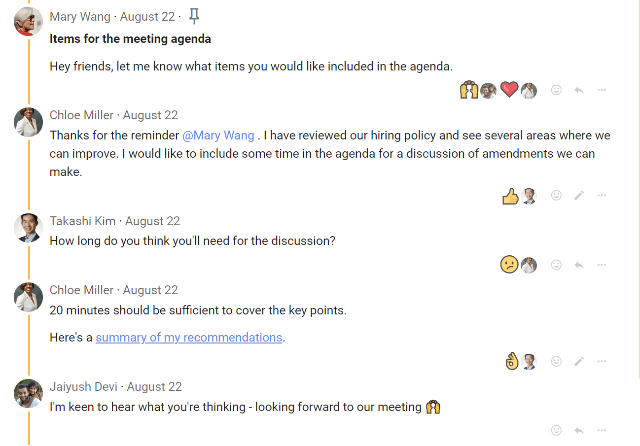 Discussions keep everything about a topic in one place. Over time you'll create a useful archive of your organization's discussions and decisions.