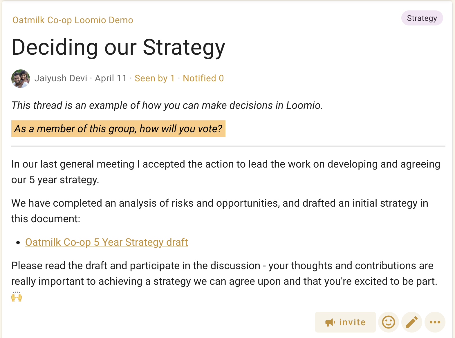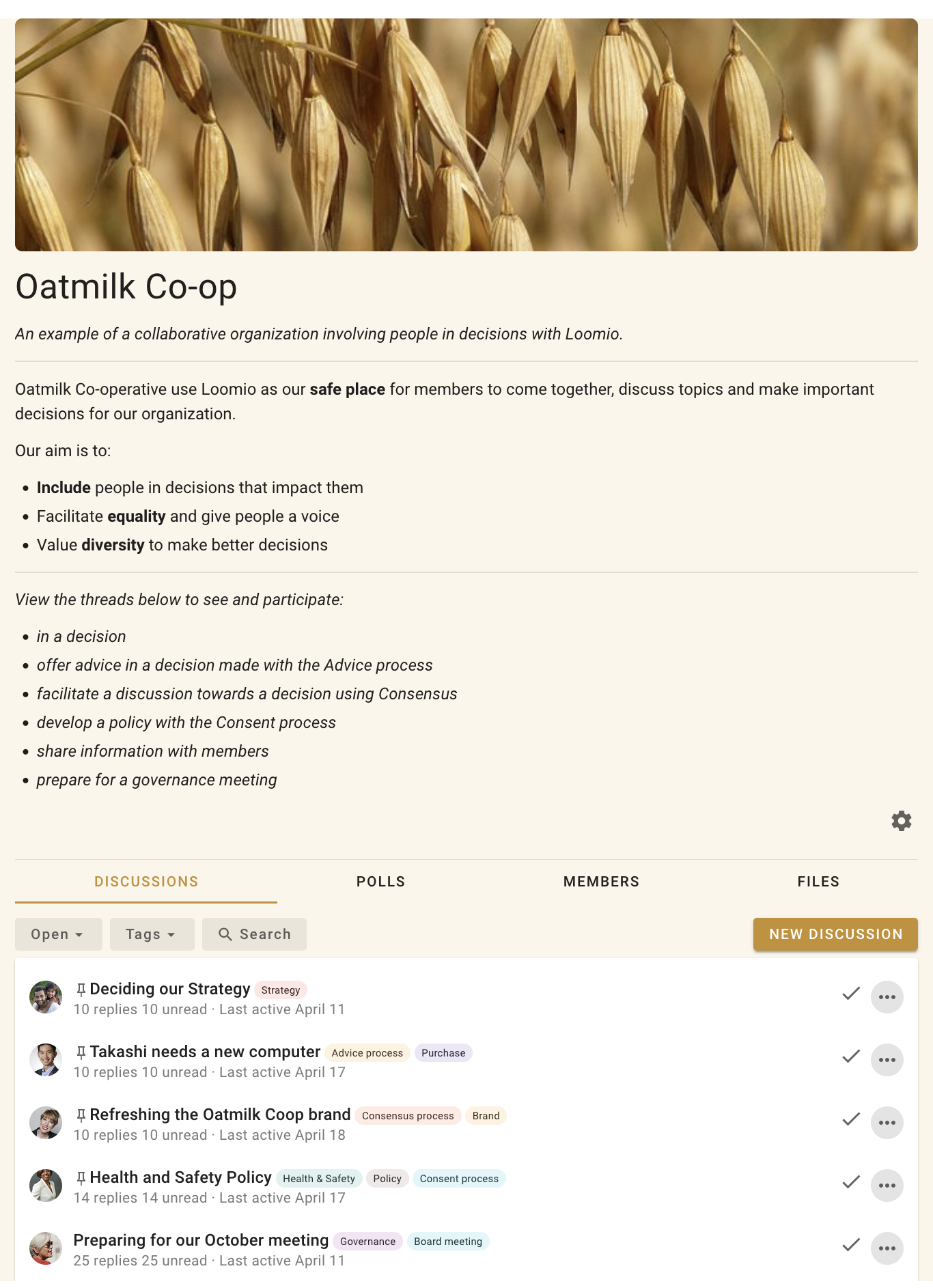 A Loomio group is a safe place for your organization to meet, discuss and make decisions about work.