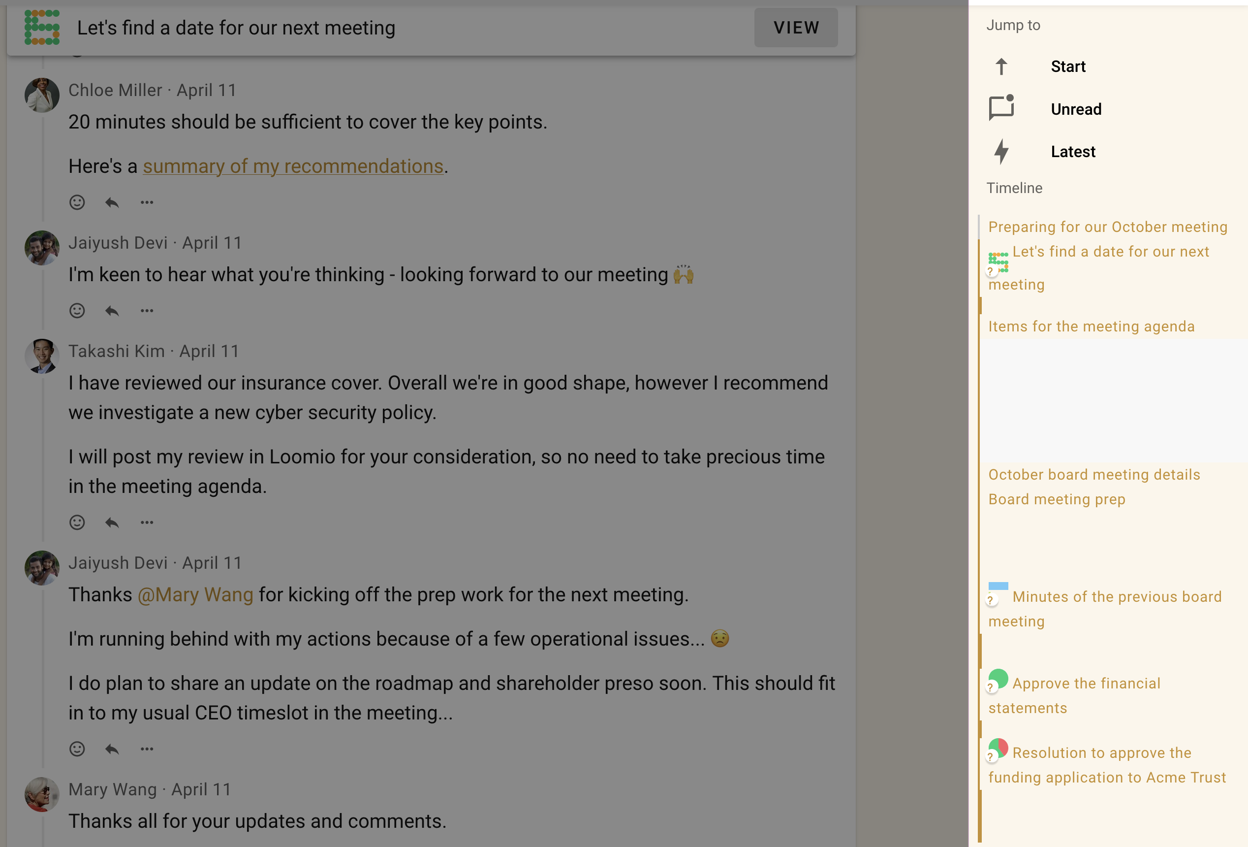 The discussion timeline builds with key activity in the discussion. Use it to quickly go to decisions or important comments pinned to the timeline.