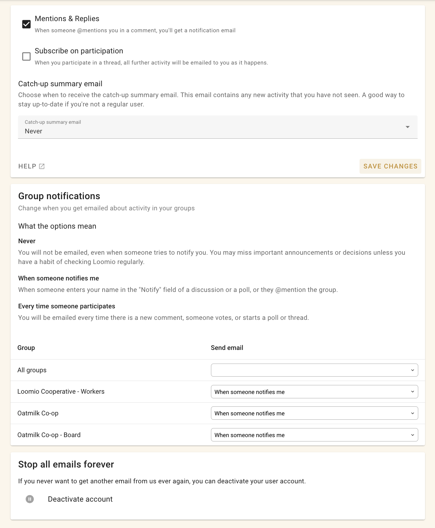 - Catch-up summary email - The 'Yesterday on Loomio' email includes activity from all your groups and threads that you have not read yet, and is a useful way to stay in touch with what's happening without having to visit Loomio every day.