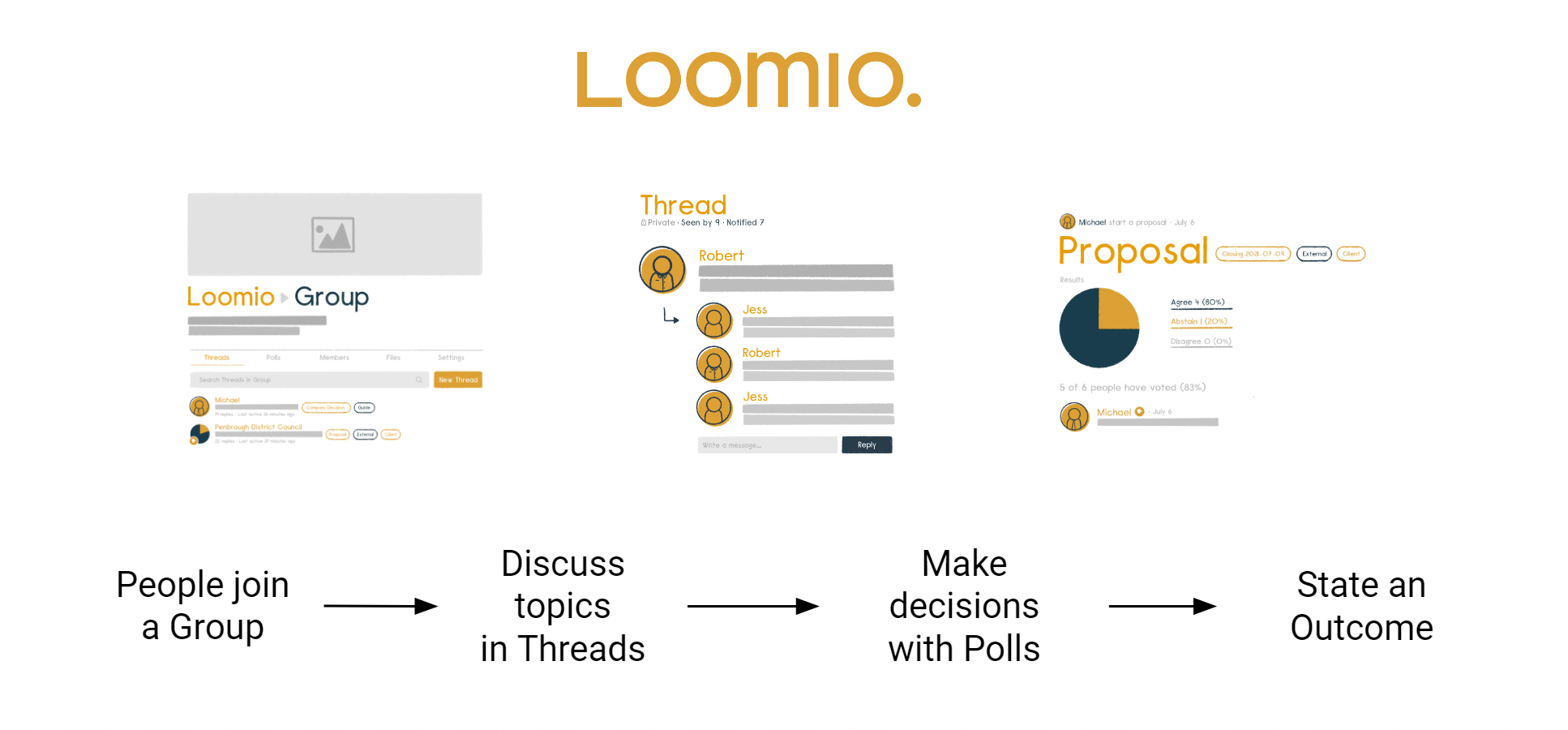 Loomio is designed to help your group come together, engage in discussions and use polls to make decisions. It has a simple structure of three main elements: Group, Discussions, and Polls.