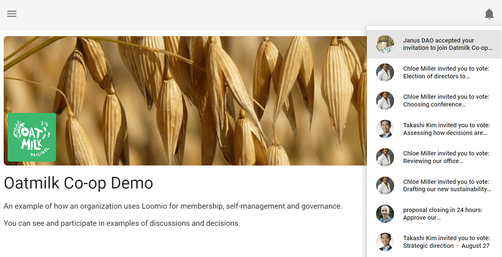 The bell icon in the top-right is where notifications are accessed within Loomio.