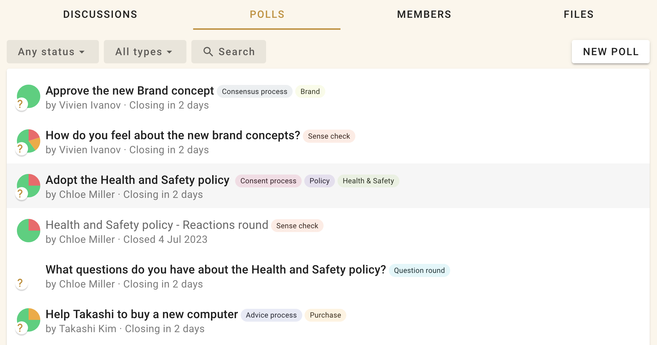 Loomio includes a wide range of poll tools to help you progress a discussion to an outcome. Each poll type has a slightly different purpose. The most common one is a proposal.