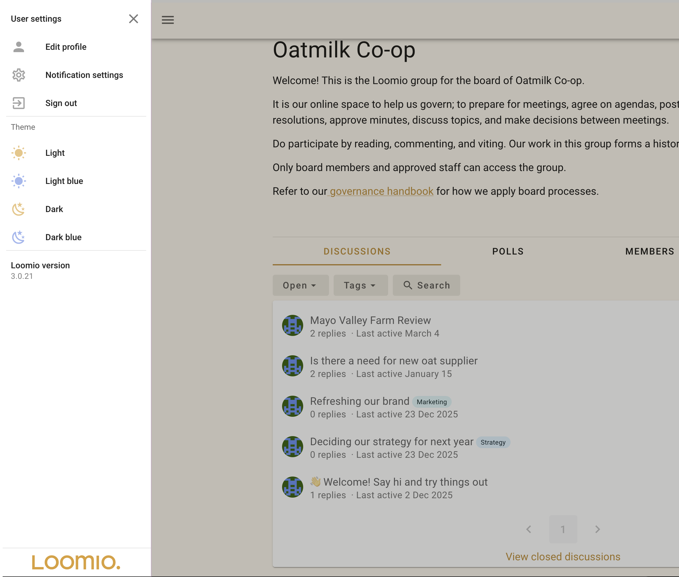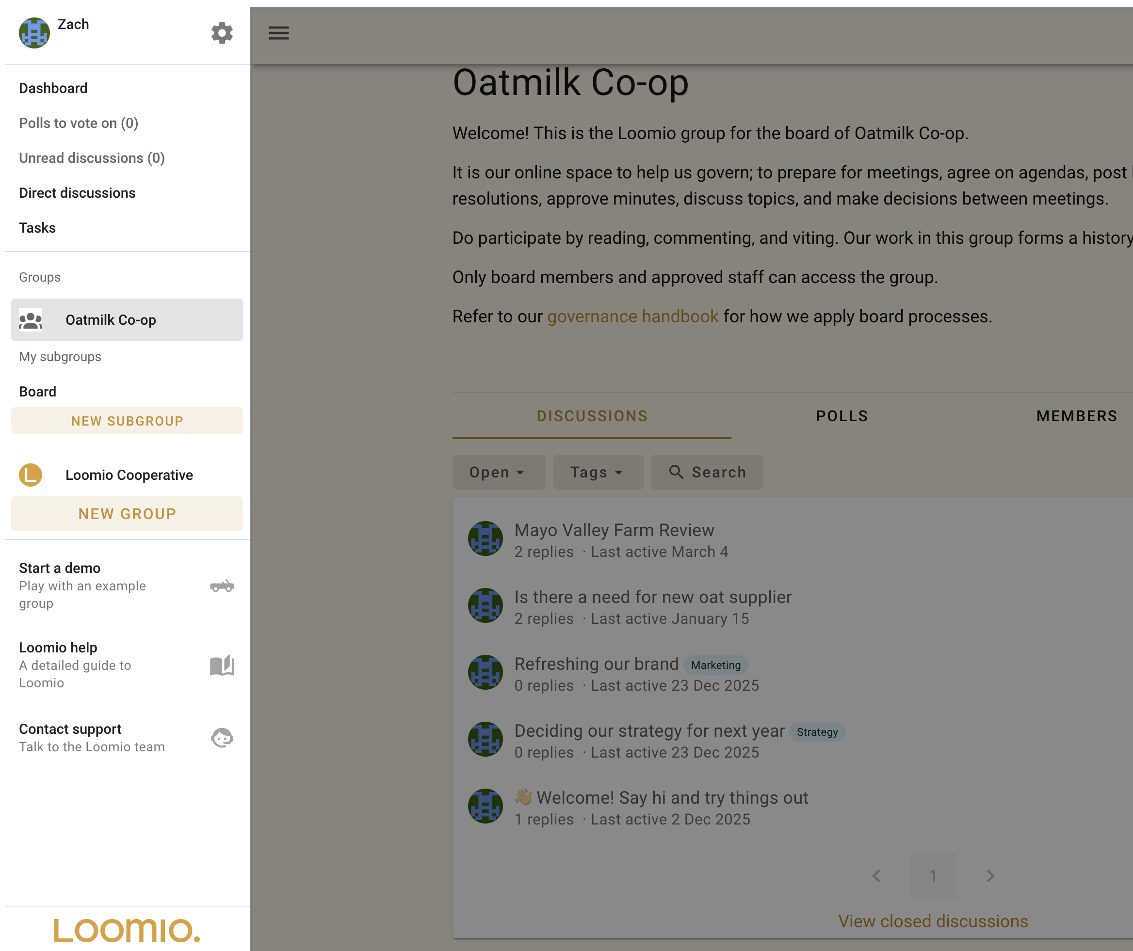 - Your Loomio groups - Where you can easily find your Loomio groups and subgroups.
