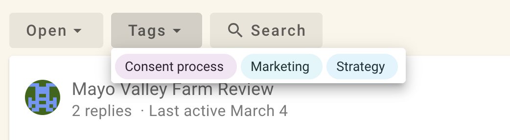 Below the tabs there is a search bar where you can type in any key word to find a particular discussion. To the left of the search bar are drop down menus where you can filter the discussions by open or closed status, or by tag.